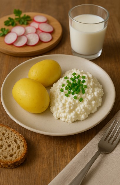 Najbardziej kultowe podanie to gzik do ziemniaków w mundurkach. Ziemniaki powinny być mączyste, równej wielkości i ugotowane al dente, aby dobrze trzymały kształt po przekrojeniu. Gorąca, parująca „pyra” i chłodny gzik tworzą kontrast temperatur oraz konsystencji. W wersji obiadowej podaj 2–3 średnie ziemniaki na osobę z czubatą porcją pasty; w wersji przekąskowej wystarczy jeden ziemniak z dekoracyjną łyżką gzika i posypką z ziół.